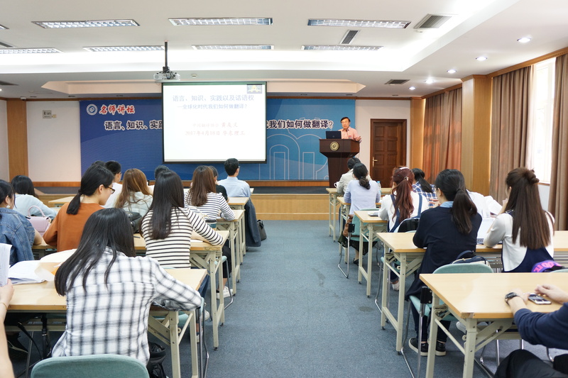 4月18日下午,应ylzzcom永利总站线路检测邀请,全国政协外事委员会委员、中国翻译协会常务副会长黄友义教授在徐汇校区逸夫楼演讲厅作了题为“语言、知识、实践以及话语权——全球化时代我们如何做翻译”的精彩报告。ylzzcom永利总站线路检测副院长吴建伟、赵宏及来自各学院的近百名师生参加报告会。报告会由ylzzcom永利总站线路检测王建国教授主持。