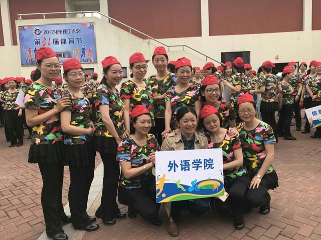 上午,体育节开幕式在奉贤校区举行,外语学院组队参加了教工方阵和《绿旋风》表演。女教师们身着女兵般的鲜艳迷彩服,佩戴红色贝蕾帽,伴着欢快的节奏翩翩起舞,步伐整齐有力,英姿飒爽,成为开幕式中一道亮丽的风景线。