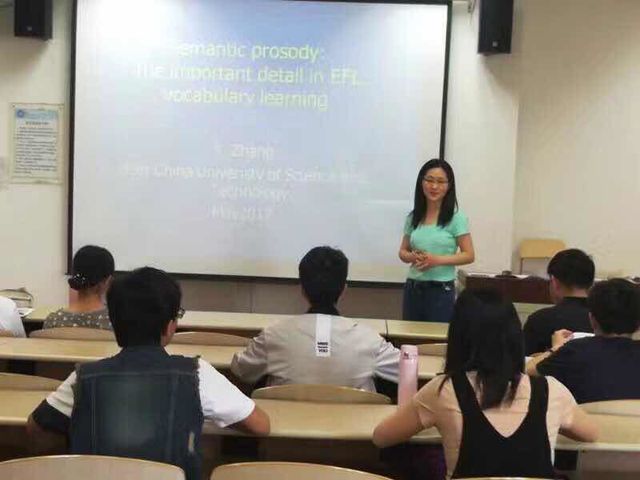 5月11日中午,学院大学英语教学部张艳博士在奉贤校区E教119室为本科生作了一场题为“大学英语词汇学习中的语义韵——你可能忽略的重要细节”的学术讲座。本讲座是人文社会科学处65周年校庆之青年学术论坛(奉贤校区专场)活动之一,ylzzcom永利总站线路检测本学期校庆期间的学术系列讲座活动正式拉开帷幕。