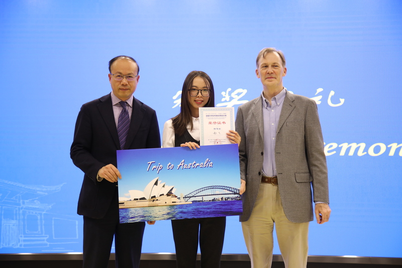 本次竞赛分已备演讲、即兴演讲和澳大利亚知识问答3个部分。谢飞以其清晰的思路、流畅的语言、敏捷的反应、广博的知识和出色的台风,摘得桂冠。澳大利亚驻上海总领事梅耕瑞先生、复旦大学校长助理陈志敏教授为其颁奖。