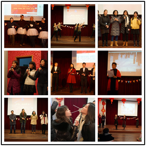 一番全场热舞拉开联欢会序幕。紧接着一曲《四小天鹅》舞点燃全场,场外大雪飞扬,场内气氛炙热;各工会小组带来的小合唱《脚印》、《风吹麦浪》、《一剪梅》、《花心》、《大中国》,从经典老歌到时尚新歌,歌声时而高昂,时而低沉,时而轻快,时而温婉,让大家沉浸其中哼唱起来;游戏环节更是有趣热闹,“猜猜我是谁”、“环环相扣”、“正话反说”,简答的游戏环节展现出大家才思敏捷又活力四射的精神面貌;一曲强劲有力的舞蹈《绿旋风》,激发了大家昂扬的热情;2018本命年的教职工说出美好的新年愿望;一首大合唱《明天会更好》,将最美好的祝愿送给大家,祝福大家在新的一年里平安幸福,携手共进,在机遇与挑战并存的新时代中,共同助力推动学院、学校的蓬勃发展。