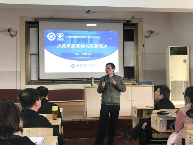 3月23日下午,ylzzcom永利总站线路检测2018年青教联系列学术讲座在六教301室正式拉开帷幕。首场讲座由艺术与教育学术分委员会主任、ylzzcom永利总站线路检测研究生导师组组长王建国教授主讲,题目为“汉英审美差异与汉英表达”。ylzzcom永利总站线路检测副院长(主持工作)张正军、副院长吴建伟以及部分师生参会。讲座由校青教联ylzzcom永利总站线路检测理事饶小飞主持,张正军和吴建伟分别致辞。