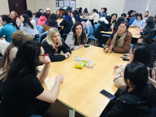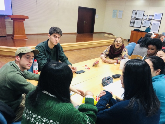 交流会上,英语161班刘菁和英语174班楼科依介绍了中国的大学生活和永利官网特色,英语171班陈彦尔和李品怡分别表演了舞蹈,英语182班鲍彦轩演唱了英文绕舌乐,英语173班李舸洋邀请全体同学一起合唱了《对面的女孩看过来》,全场气氛达到高潮,随后中美学生分组进行了自由交流,大家就中美教育体制区别、课程设置、校园文化、课外活动、未来规划等话题进行了热烈的讨论,纷纷表示这种面对面的跨文化交流加深了彼此对中美文化的理解。